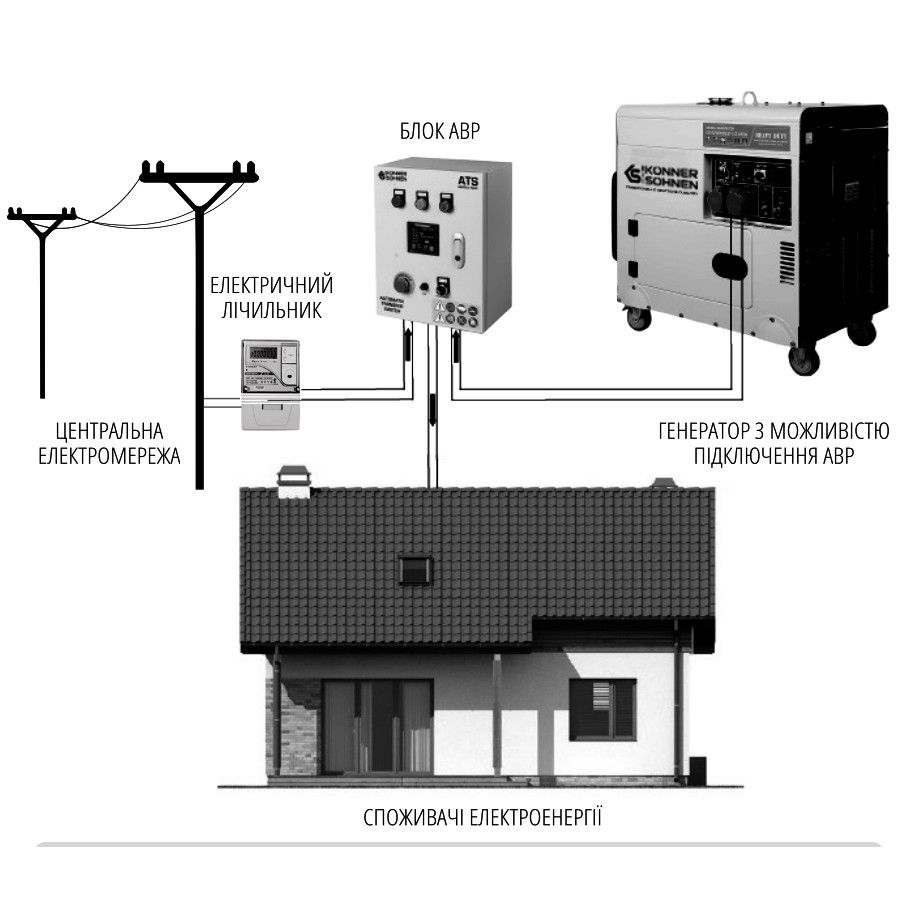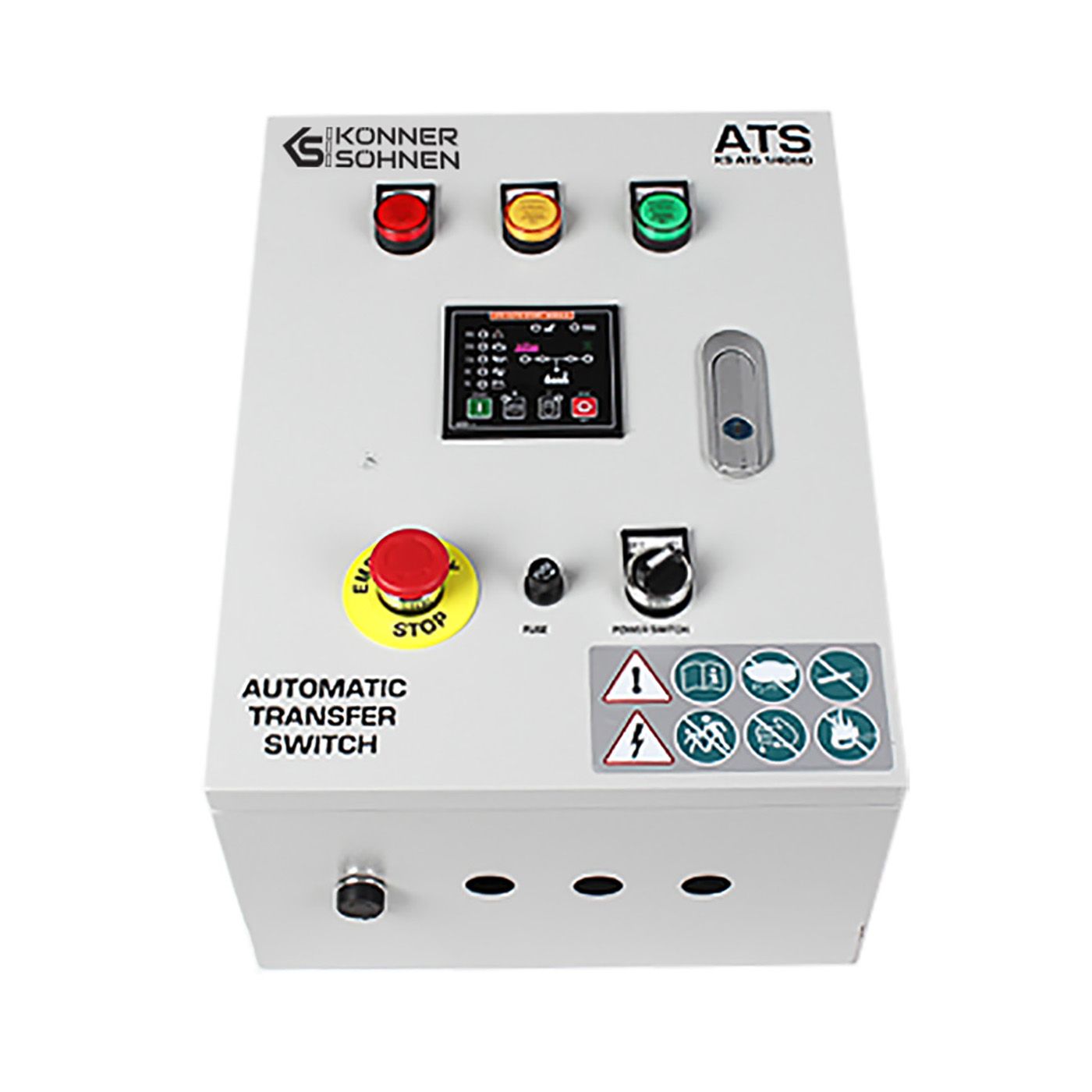Блок автоматичного введення резерву (AВР) Konner & Sohnen KS ATS 1/40HD автоматично запускає генератор і передає навантаження на нього при відключенні основного джерела живлення та автоматично зупиняє роботу генератора при відновлення центрального електропостачання.