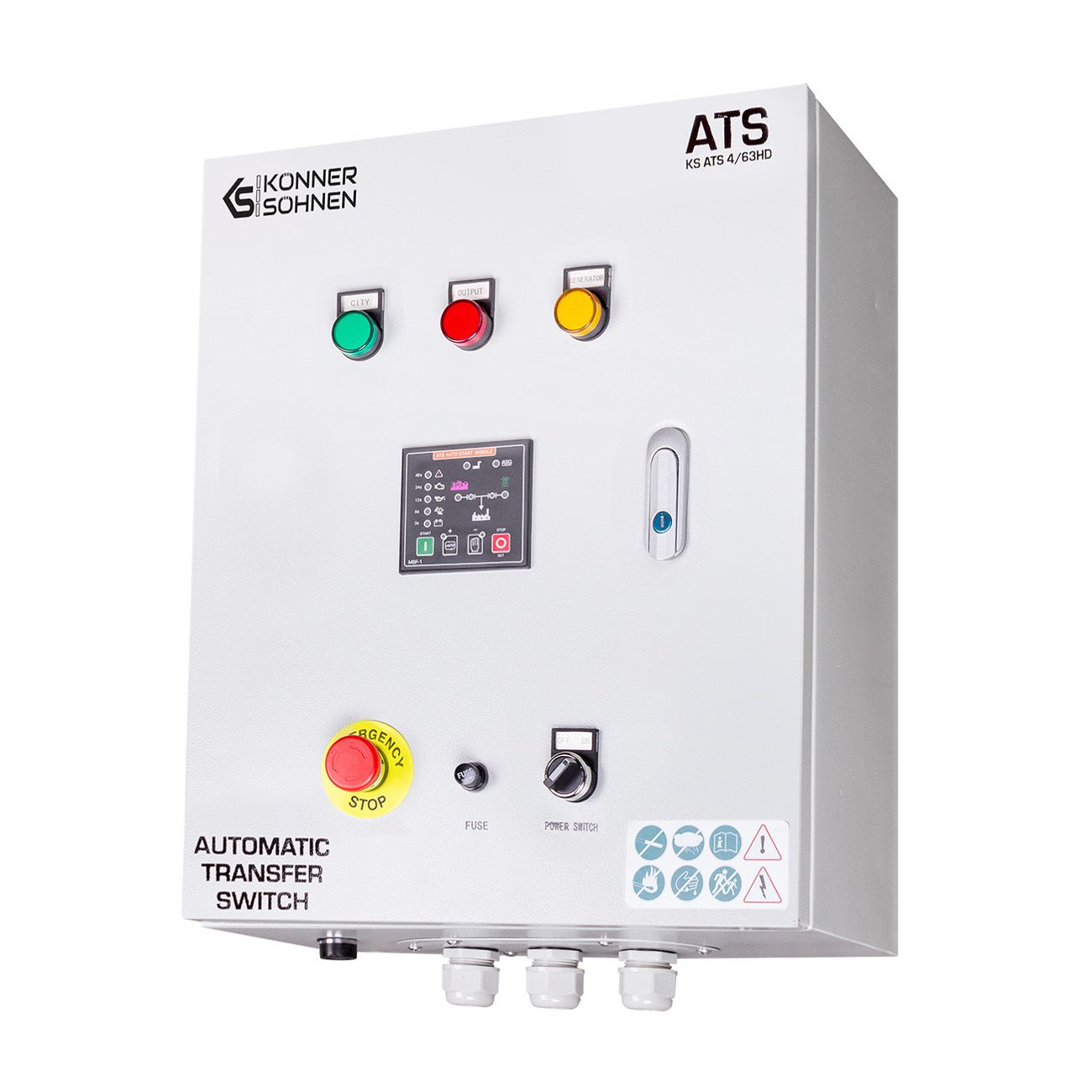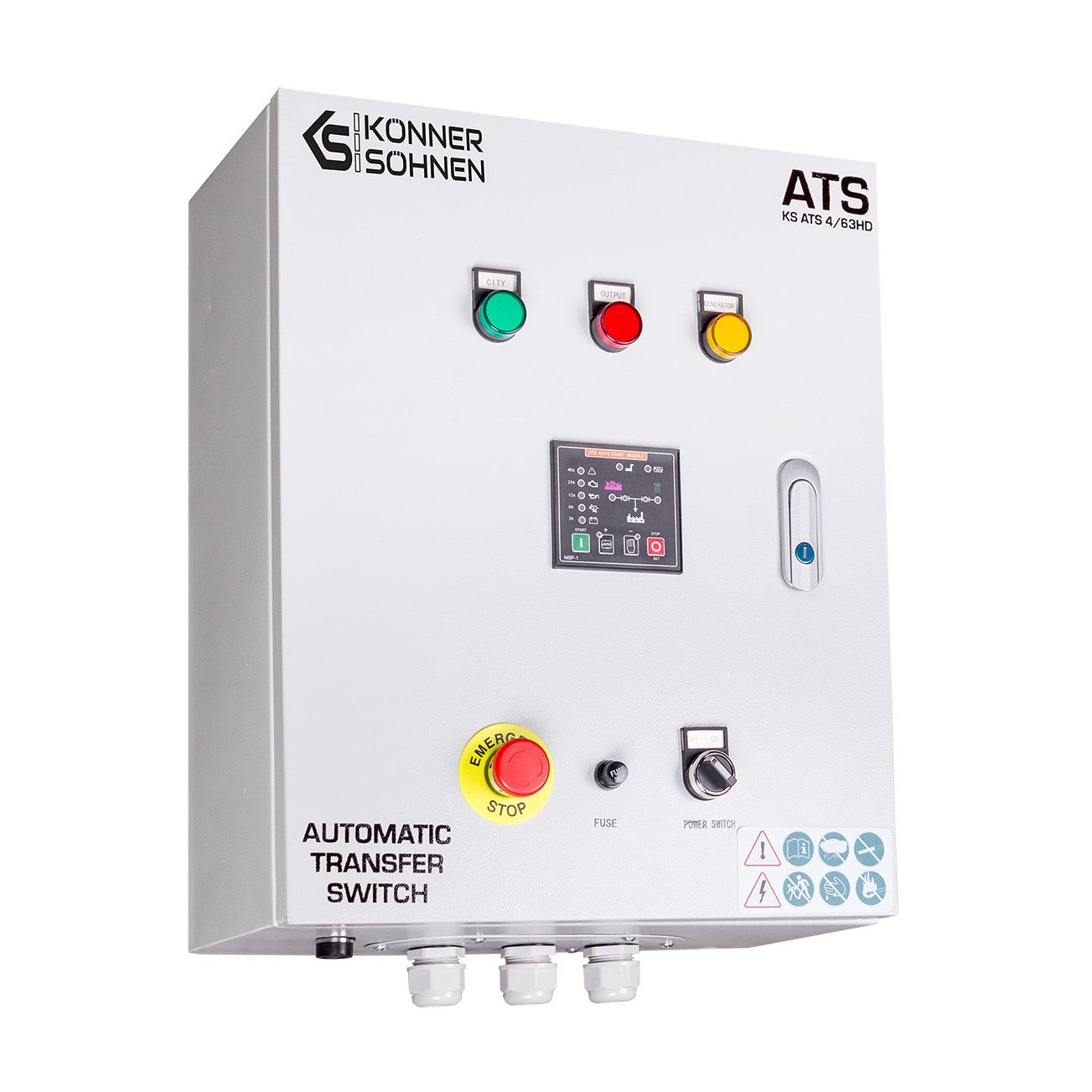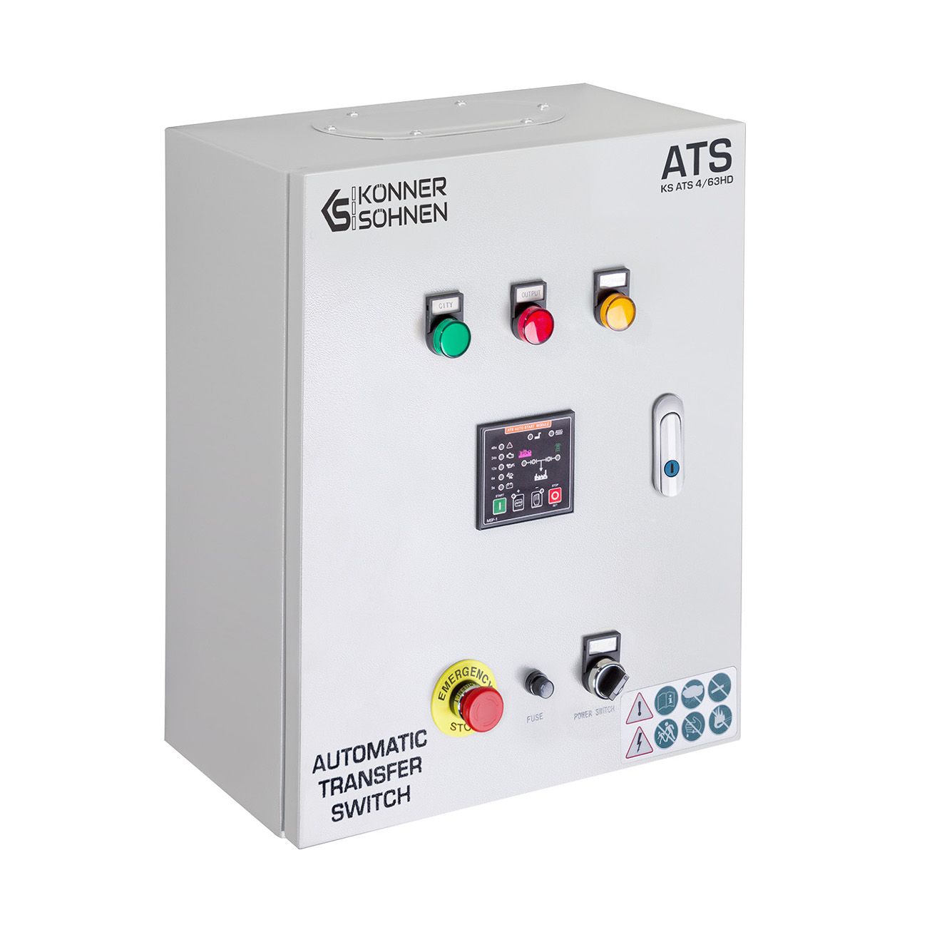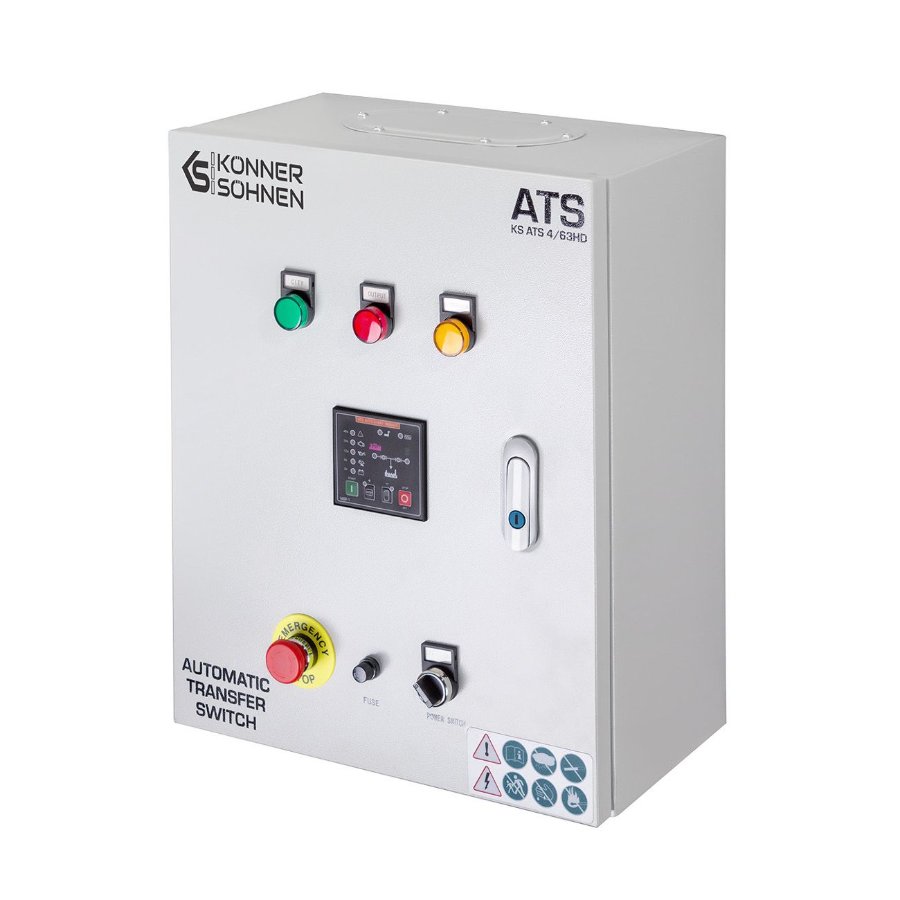 Блок автоматичного введення резерву (AВР) KS ATS 4/63HD німецької торгової марки Könner & Söhnen автоматично запускає генератор і перемикає навантаження на нього при відключенні основного джерела живлення, та автоматично зупиняє роботу генератора при відновленні центрального електропостачання. Підходить для дизельних генераторів, що оснащені універсальним 6-піновим роз’ємом для підключення блоку автоматичного введення резерву (вхід для АВР). Блок АВР має контролер, який дозволяє програмувати час перед автоматичним запуском генератора у випадку відключення електроенергії, час прогріву генератора перед підключенням навантаження та сигналізує про виявленні помилки. Має кнопку аварійної зупинки генератора. Блок АВР може працювати як в автоматичному так і в ручному режимі.