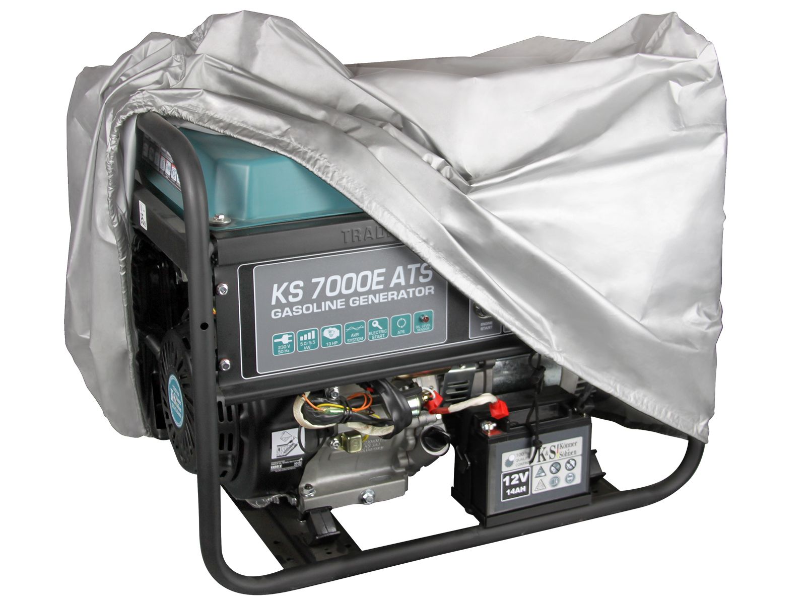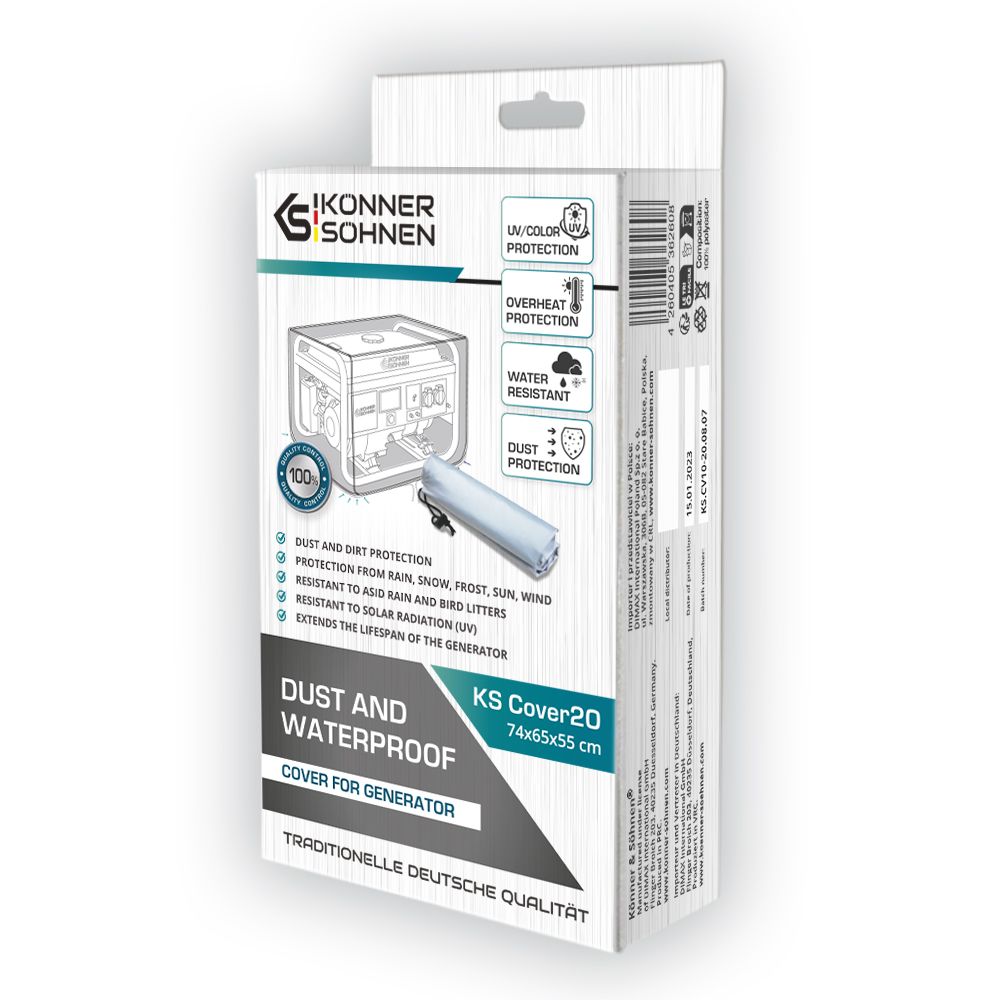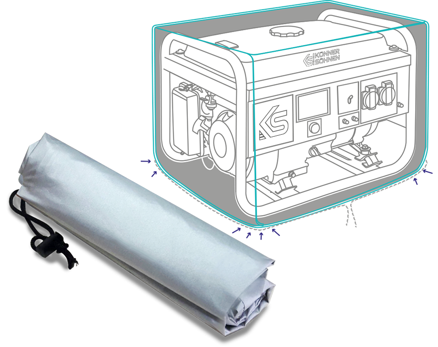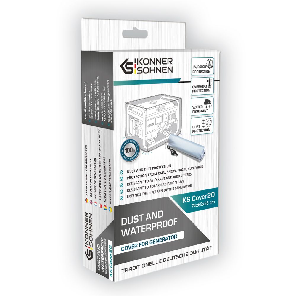 Чохол для генератора KS Cover 20 Konner&Sohnen-це водонепроникний і пилозахисний чохол, який призначений для захисту бензинових і дизельних генераторів серії KS 5000, KS 6000, KS 7000, KS 8000, KS 9000, KS 10000. Чохол виготовлений з міцного поліестеру з поліуретановим покриттям, яке забезпечує високу вологостійкість і захист від ультрафіолету. Чохол має еластичну стрічку з липучками для надійного кріплення до генератора.