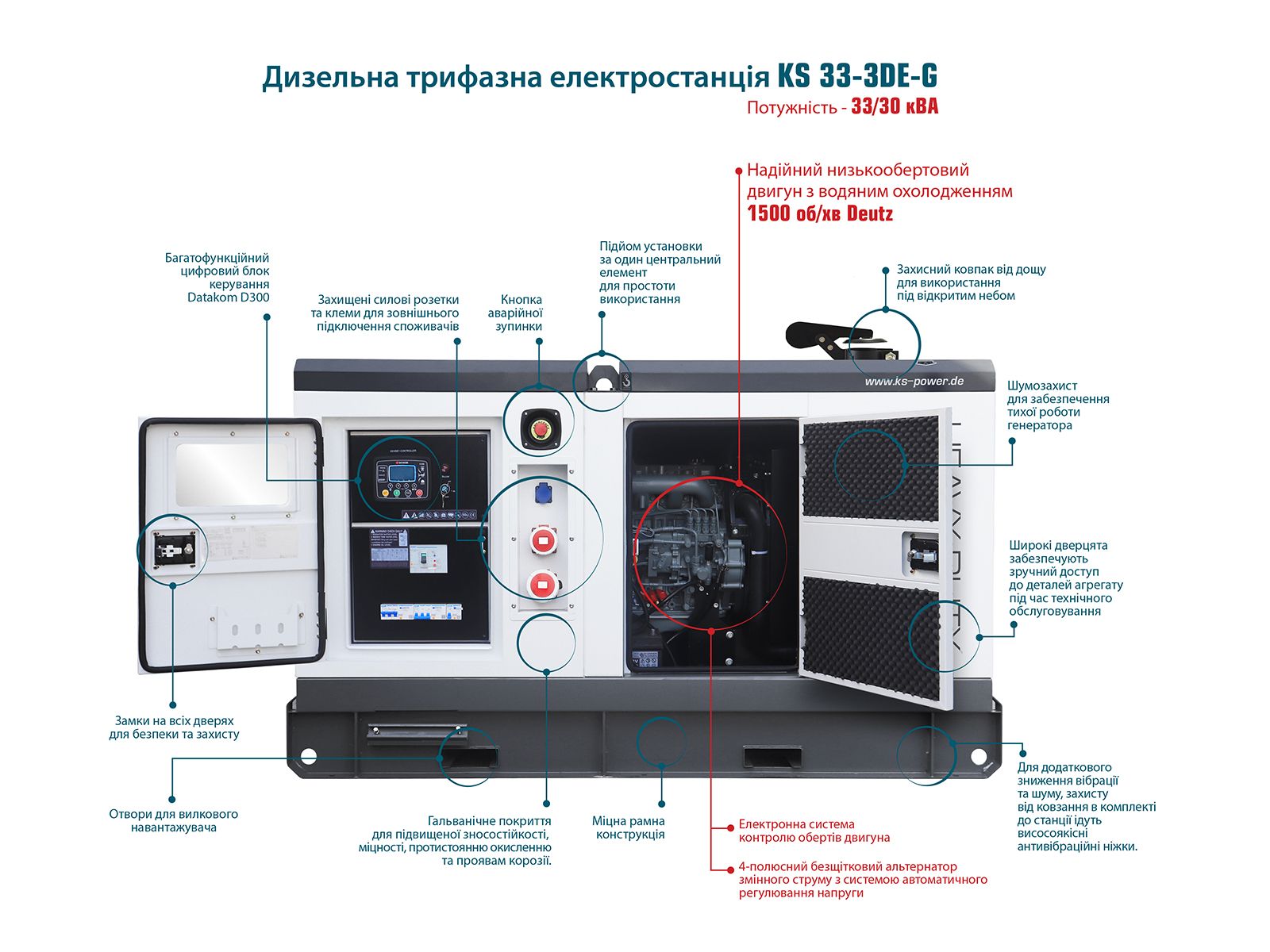 Станція оснащена низько обертовим 4-циліндровим двигуном Deutz з рідинним охолодженням. Німецька компанія Deutz вже понад 150 років виробляє дизельні двигуни (в тому числі для автомобільної та сільгосптехніки), що поєднують у собі сучасні технології та матеріали, найвищу якість, надійність, безвідмовність та довговічність. Мотори Deutz успішно працюють у найнесприятливіших умовах та витримують максимальні навантаження без зниження моторесурсу. Крім того модель дизельного генератора KS 33-3DE-G оснащена 4-полюсним безщітковим альтернатором змінного струму з системою автоматичного регулювання напруги, підігрівом для зимового використання, з паливним баком на 57 літрів, розрахованому на понад 15 годин автономної роботи без дозаправки (при середньому навантаженні 50% витрата палива складає 3,7 літри/год), можливістю підключення системи автоматичного запуску/зупинки, всепогодним захисним антивандальним корпусом із звукоізоляцією та антикорозійним гальванічним покриттям.