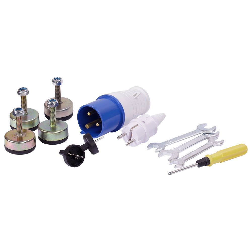 ДОДАТКОВІ АКСЕСУАРИ Генератор укомплектований додатковими аксесуарами: вилка переносна 2Р+РЕ 16А 230В, силова вилка переносна 2P+Е 230В, 32А, ключ ріжковий, 8×10 мм, ключ ріжковий, 12×14 мм, ключ ріжковий, 17×19 мм, викрутка двостороння 6.0 мм, РН2.