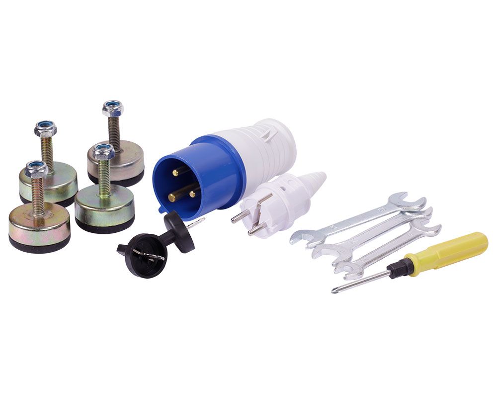 ДОДАТКОВІ АКСЕСУАРИ Генератор укомплектований додатковими аксесуарами: вилка переносна 2Р+РЕ 16А 230В, силова вилка переносна 2P+Е 230В, 32А, ключ ріжковий, 8×10 мм, ключ ріжковий, 12×14 мм, ключ ріжковий, 17×19 мм, викрутка двостороння 6.0 мм, РН2.