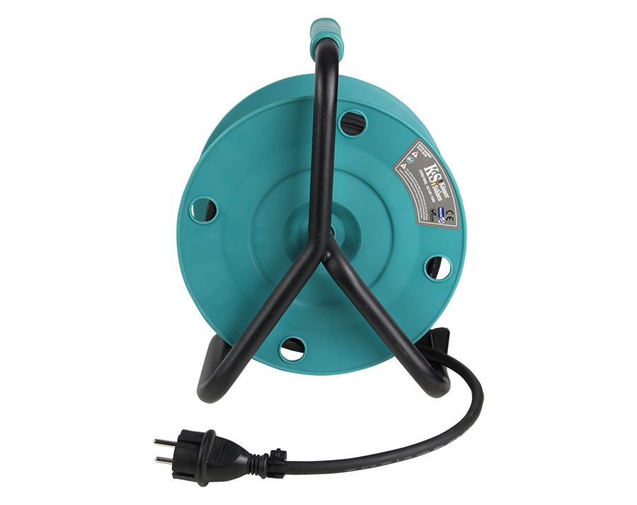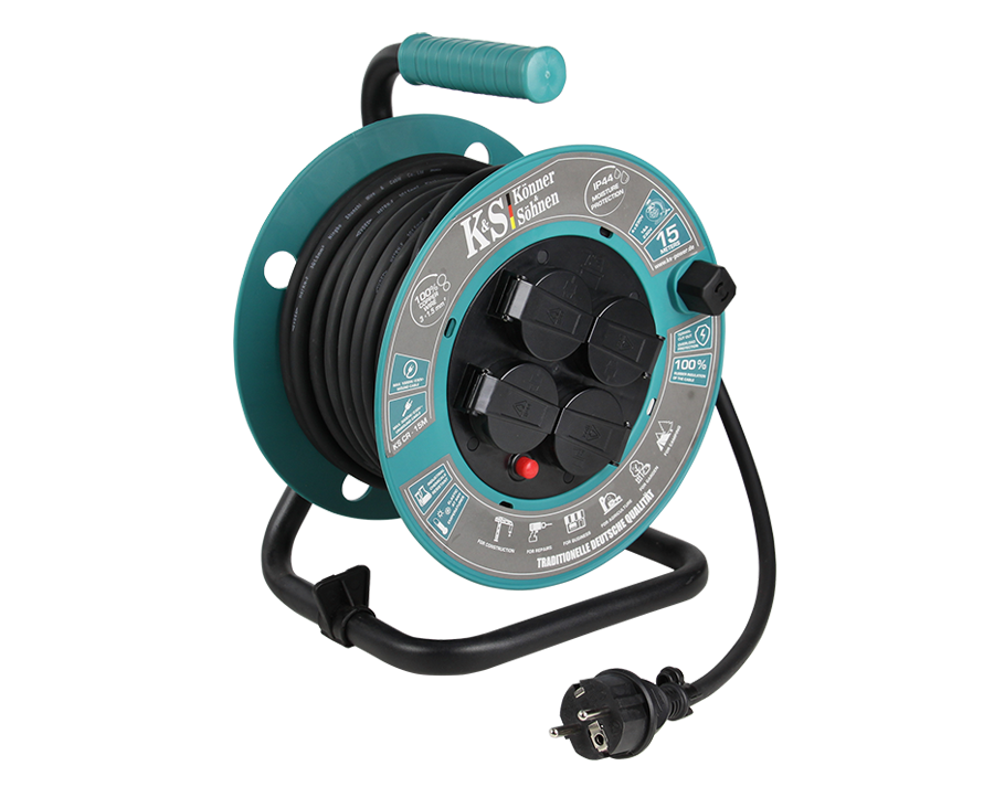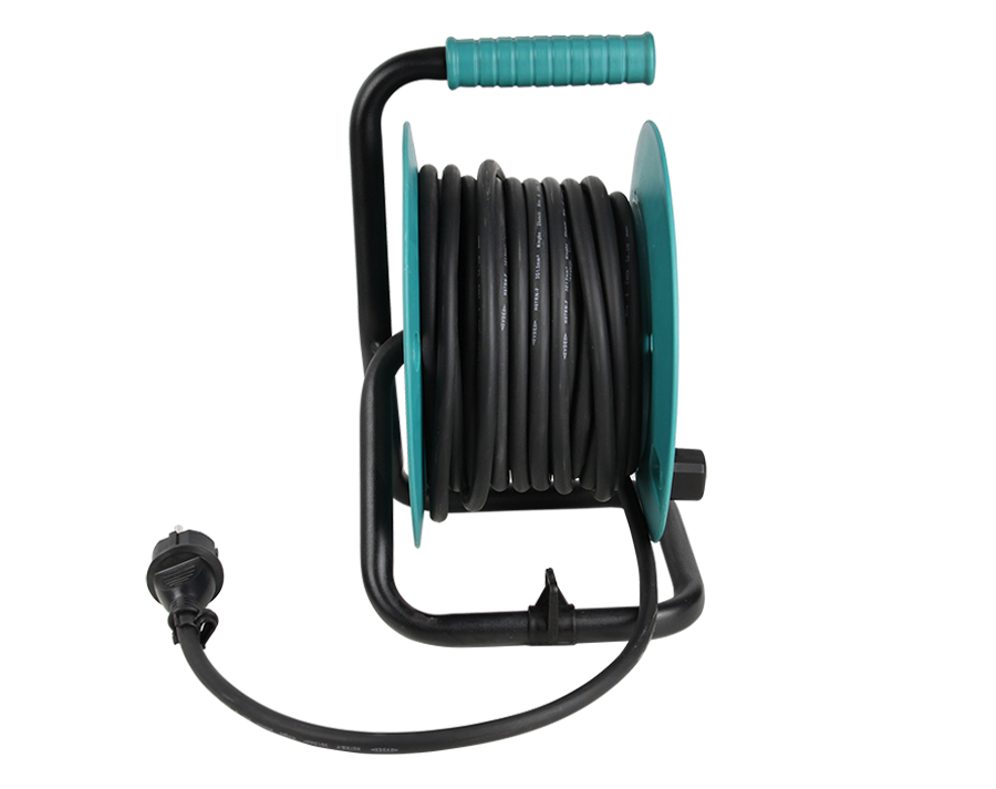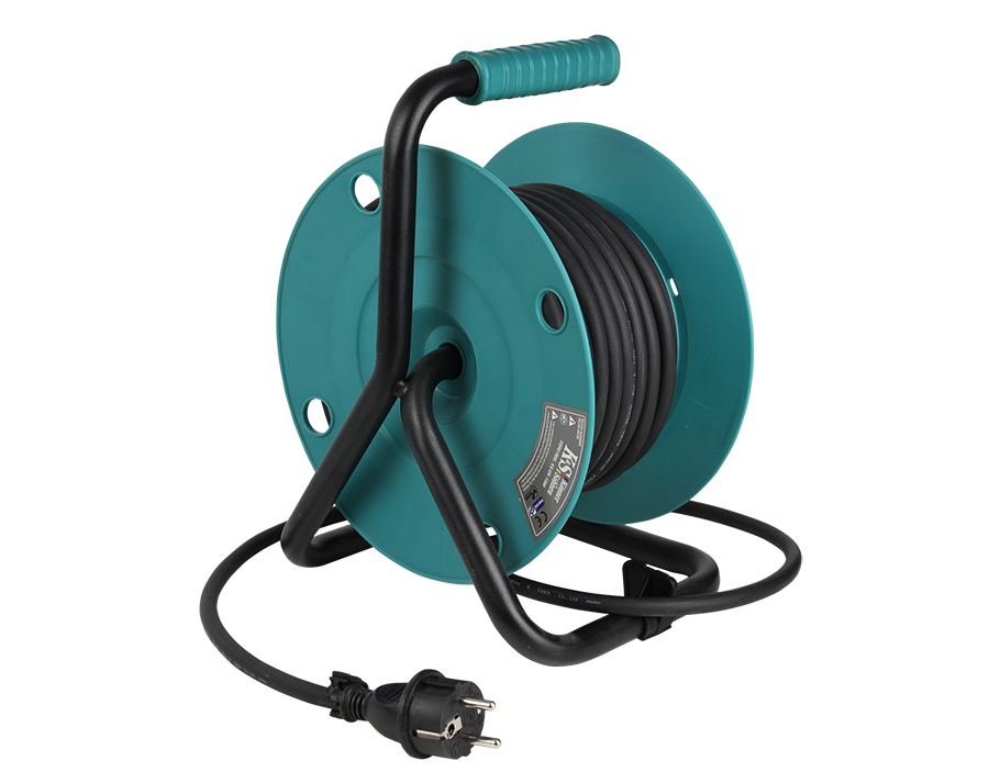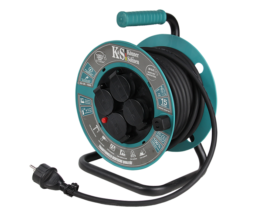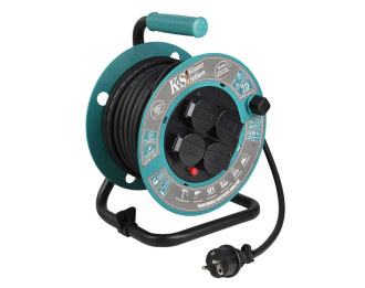 Котушка виготовлена зі спеціального посиленого пластику, має міцну металеву рамну конструкцію, стійку до пошкоджень. Оснащена ергономічною гумовою ручкою для комфортного переміщення, фіксатором кабелю, кріпленням для регулювання направлення кабелю, фіксатором для блокування довільного розкручування котушки. Довжина кабелю сягає 15 метрів та підходить для віддаленого підключення до 4-х електричних приладів одночасно.