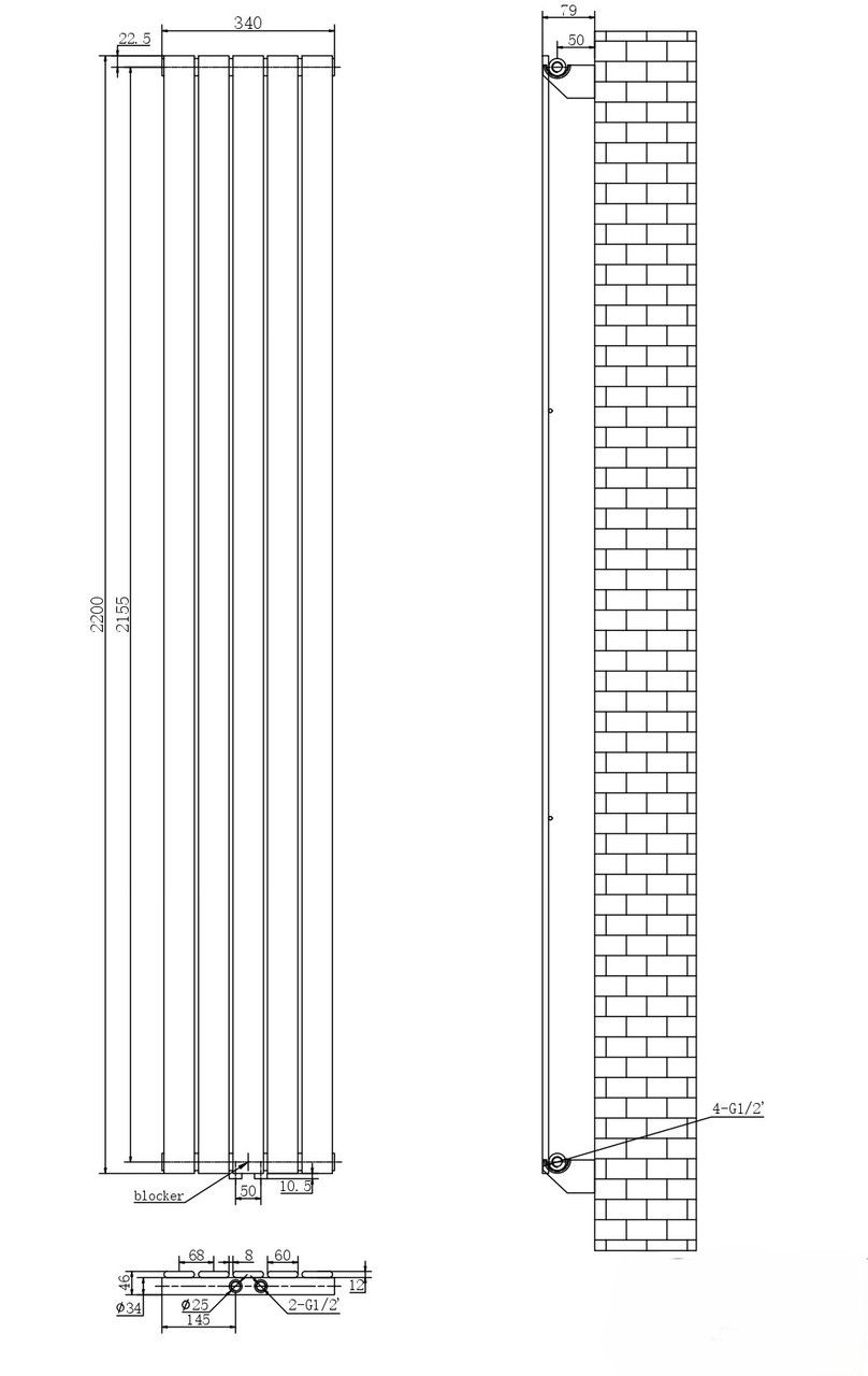 Вертикальний дизайнерський радіатор опалення ARTTIDESIGN Livorno 5/2200/340/50 чорний матовий
