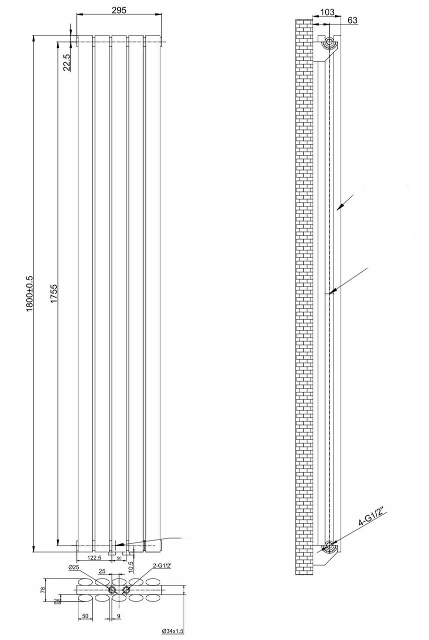Вертикальний дизайнерський радіатор опалення ARTTIDESIGN Rimini II 5/1800/295/50 чорний матовий