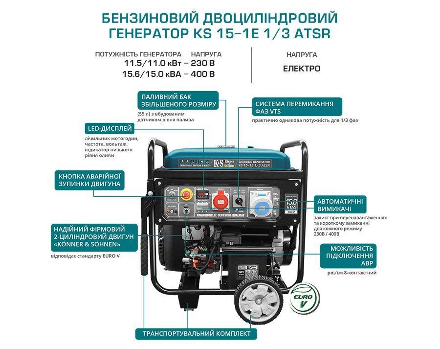 Модель генератора Konner & Sohnen KS 15-1E 1/3 ATSR з унікальною технологією перемикання фаз VTS, яка дає можливість працювати в однофазному (230В) або трифазному (400В) режимі майже з однаковою потужністю. Зручна, ергономічна панель керування з кнопкою аварійної зупинки генератора та багатофункційним LED-дисплеєм, що дозволяє контролювати роботу генератора — напругу, частоту та кількість відпрацьованих годин. Кожна модель оснащена розетками, що дозволяють знімати максимальну потужність, яка віддається приладом, розетки обладнані запобіжниками та комплектуються відповідними вилками. Місткий 55-літровий паливний бак забезпечує тривалу і безперервну роботу.