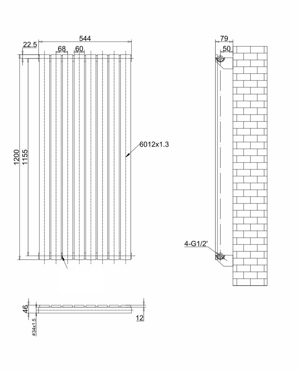 Дизайнерський вертикальний радіатор опалення ARTTIDESIGN Livorno 8/1200/544 чорний матовий.