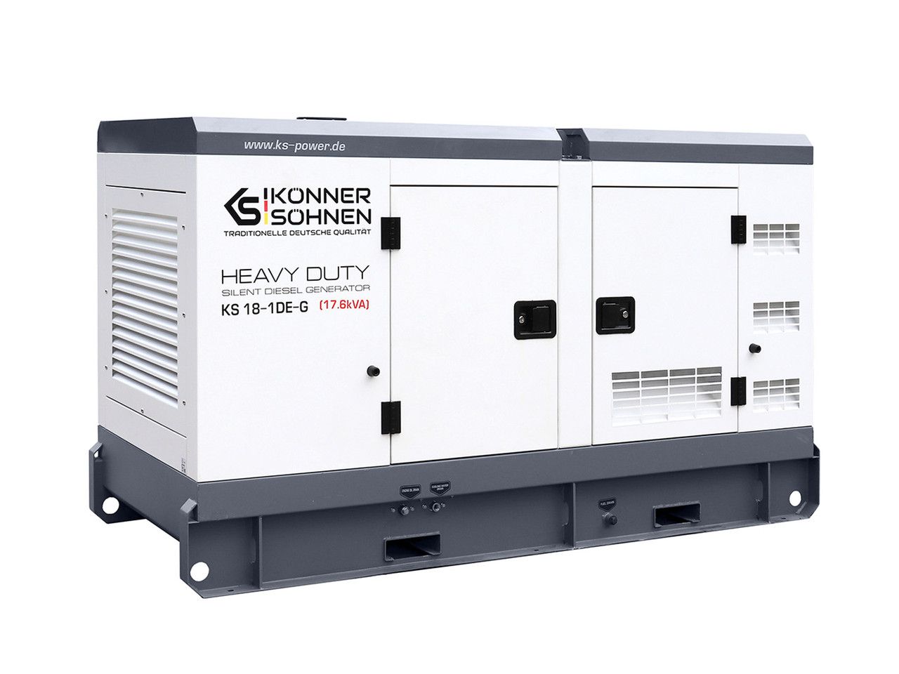 Дизельна однофазна електростанція KS 18-1DE-G серії HEAVY DUTY німецької торгової марки K?nner & S?hnen - це надійна генераторна установка максимальною потужністю 17.6 кВА, що повністю відповідає високим європейським стандартам якості.