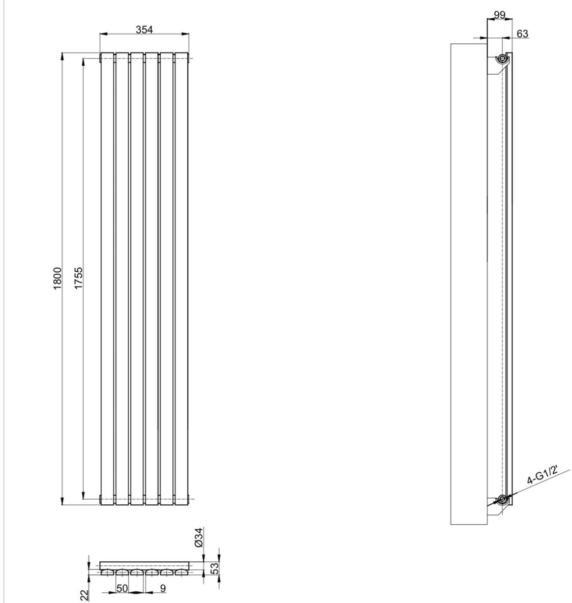 Вертикальный дизайнерский радиатор отопления ARTTIDESIGN Terni 6/1800/354/50 чёрный матовий