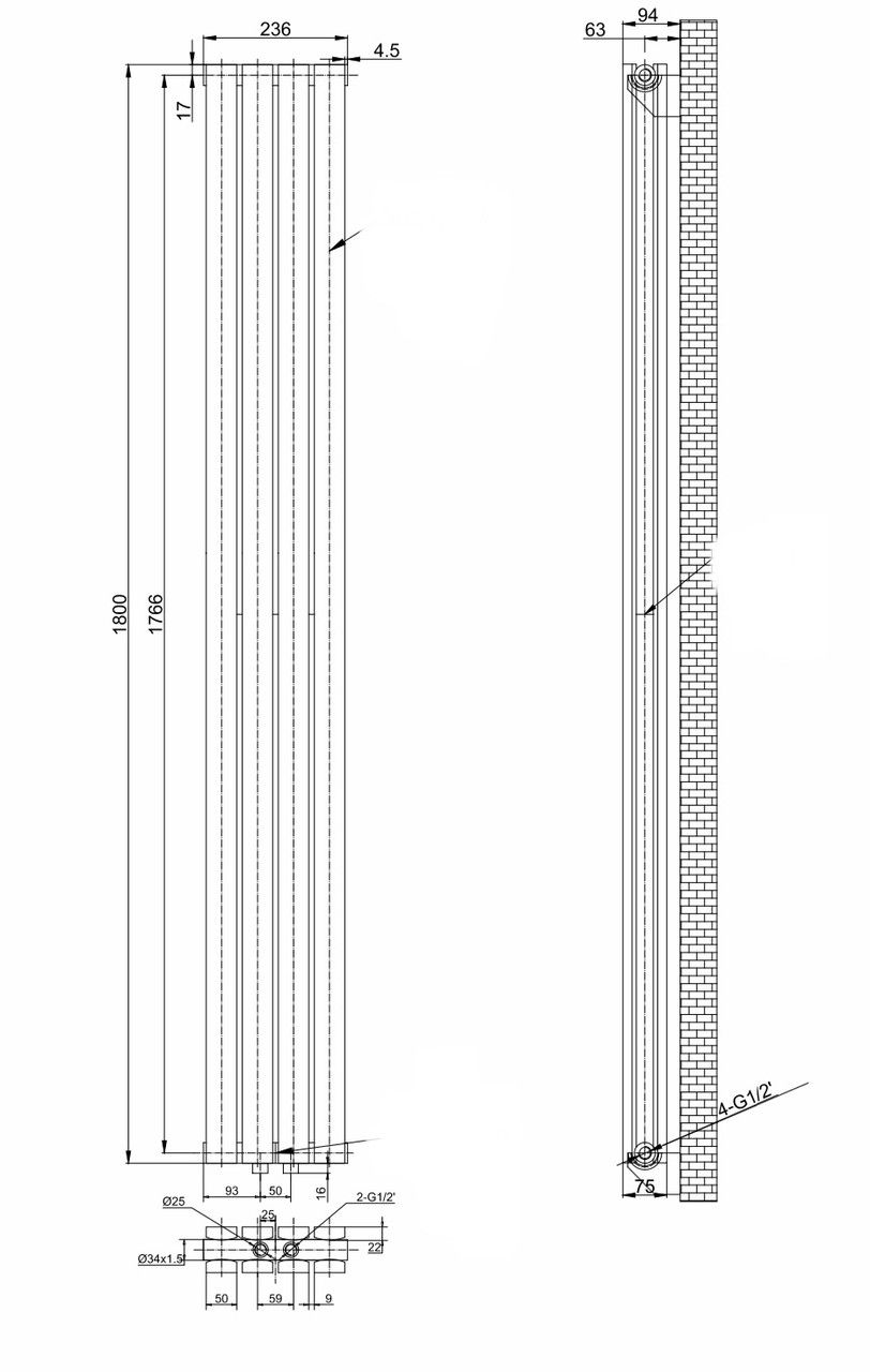 нижнее подключение по бокам 236 мм