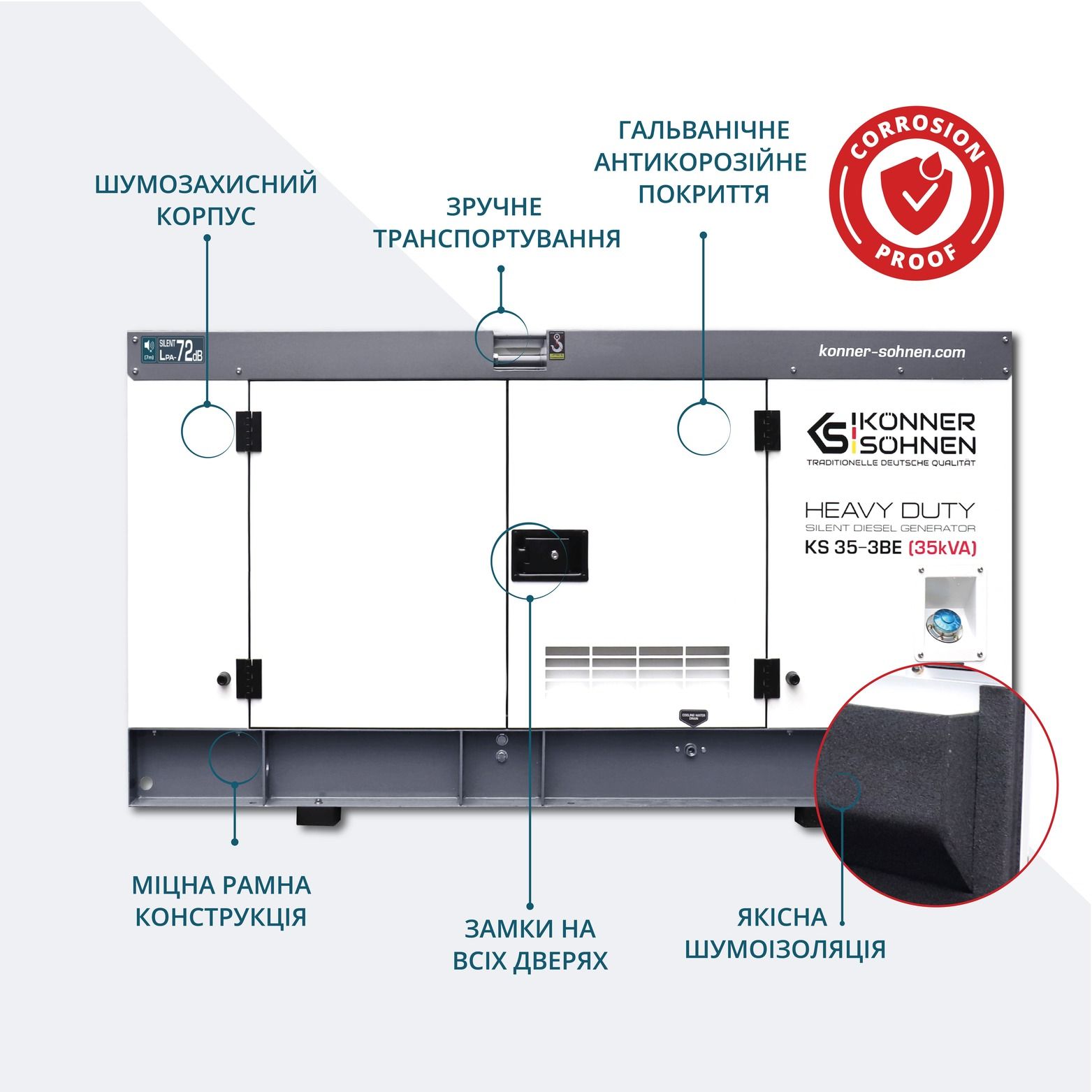 - Електростанція оснащена високоякісним шумозахисним корпусом, що значно знижує рівень шуму під час роботи. Корпус також захищає установку від вологи, конденсату та несприятливих погодних умов, а також несанкціонованого втручання.