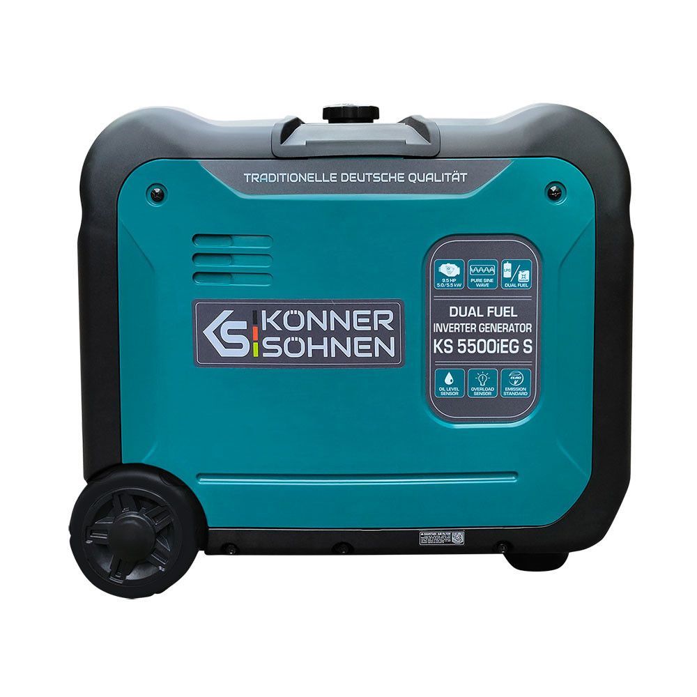 Газобензиновий генератор інверторного типу KS 5500iEG S німецької торгової марки Könner&Söhnen в шумозахисному корпусі - це зручне компактне, практично безшумне джерело електроенергії. Ключова особливість даної моделі полягає в тому, що вона виробляє електричний струм з правильною синусоїдою.