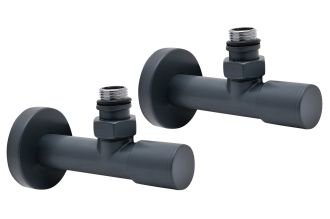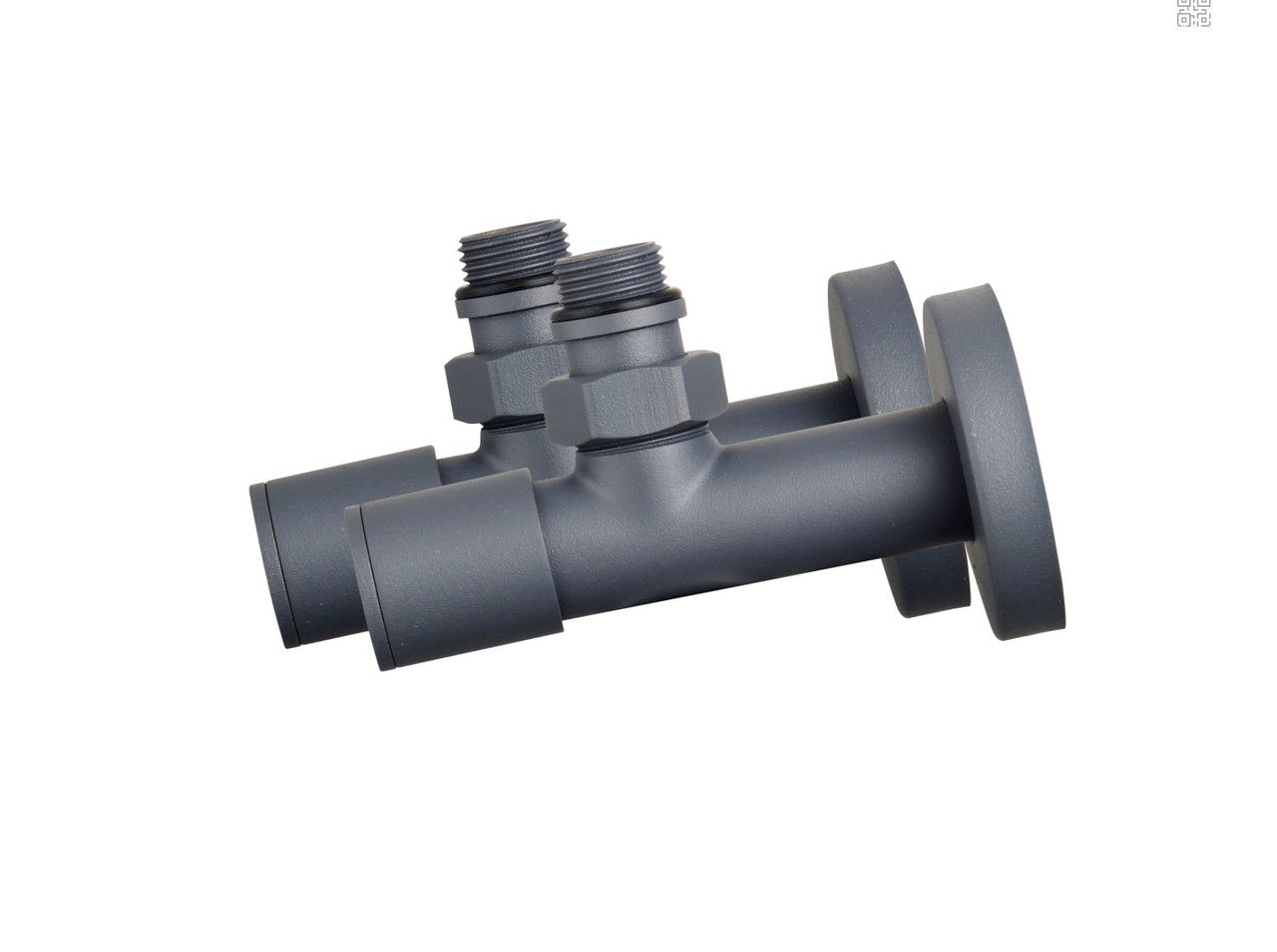 Кран кутовий подовжений вентильний (комплект 2 шт), служить для підключення полотенцесушителя. Виготовлений з латуні, Сірий матовий колір. Максимальний робочий тиск 20 бар. Різьблення: Зовнішня. Діаметр підключення: 1/2"х1/2".