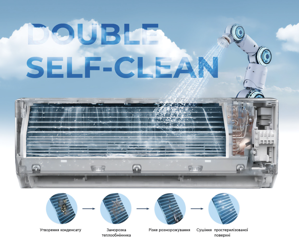 Інноваційна технологія «DOUBLE SELF-CLEAN» забезпечує автоматичне очищення від пилу, грибків, вірусів та бактерій. Використовується миттєве заморожування та подальше нагрівання пластин теплообмінника до +57-58°C, завершуючи процес очищення всього за 30 хвилин, що знижує витрати на технічне обслуговування та забезпечує більш здорову якість повітря в приміщенні.