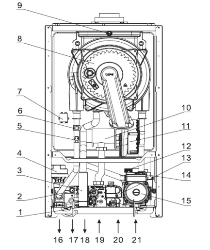 - Закрита камера згорання (прессостат, вентилятор, трубка збору конденсату);