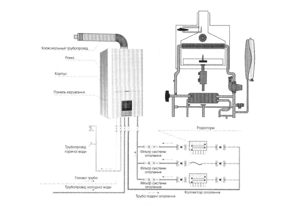 Елегантний дизайн, закрита камера згоряння та два теплообмінники. Зручний інтерфейс керування. Статус роботи котла відображається світлодіодними індикаторами.