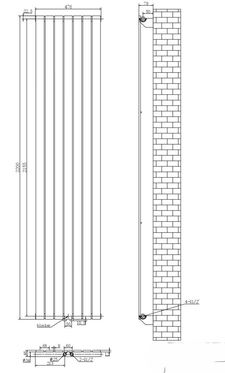 Вертикальний дизайнерський радіатор опалення ARTTIDESIGN Livorno 7/2200/476/50 чорний матовий