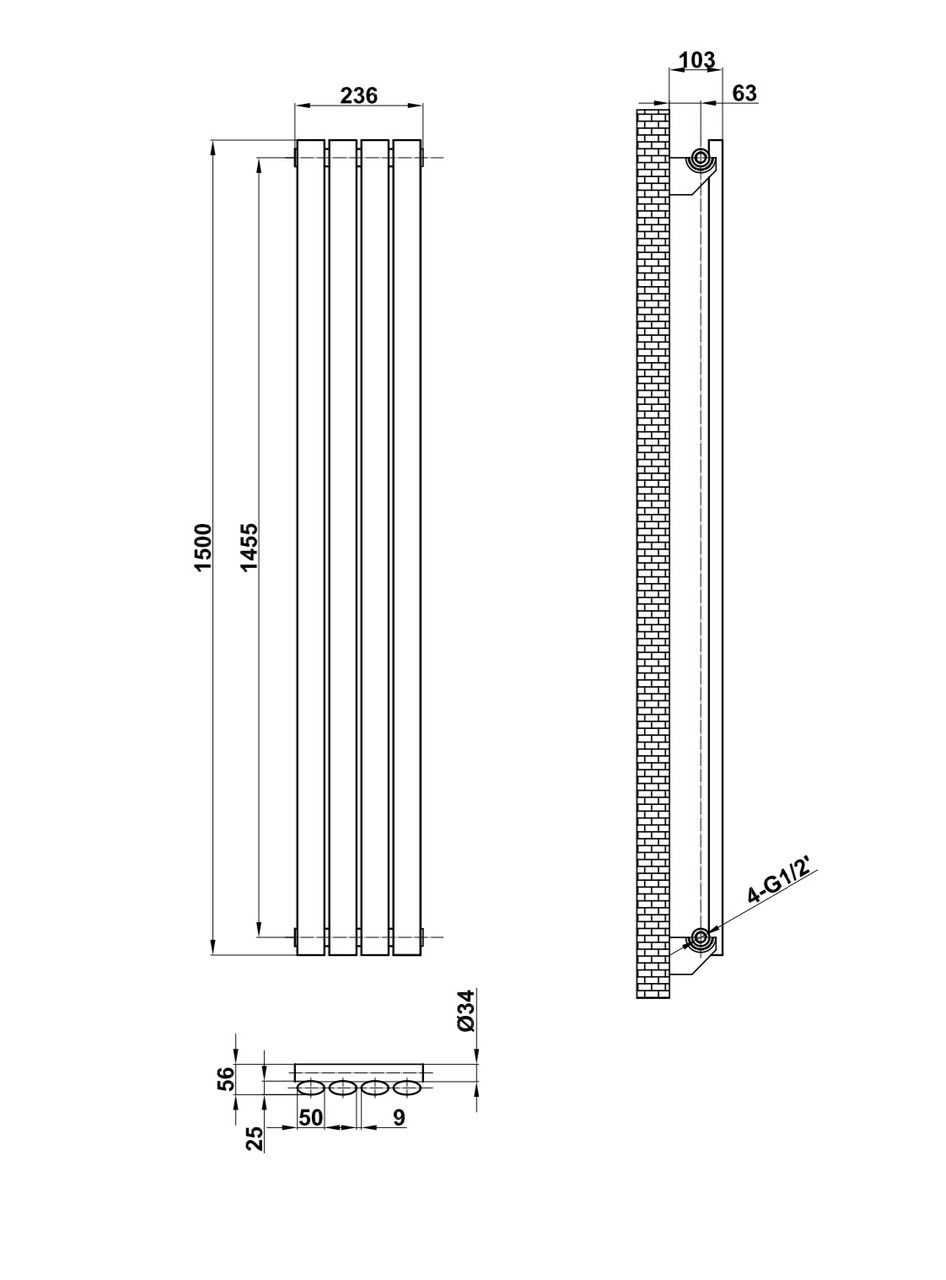 Вертикальний дизайнерський радіатор опалення ARTTIDESIGN Rimini 4/1500/236 чорний матовий