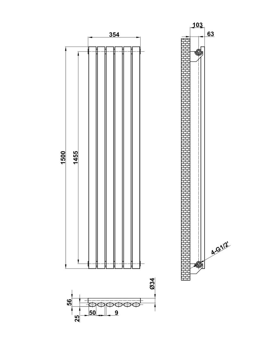 Вертикальний дизайнерський радіатор опалення ARTTIDESIGN Rimini 6/1500/354/50 білий матовий