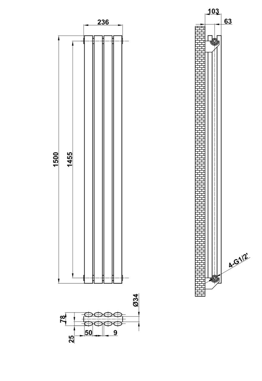 Вертикальний дизайнерський радіатор опалення ARTTIDESIGN Rimini II 4/1500/236/50 білий матовий