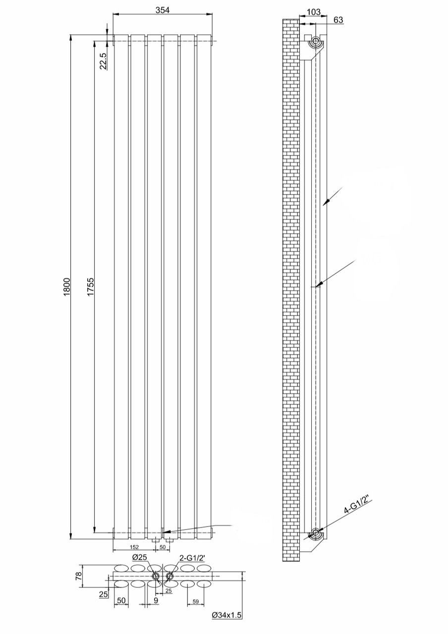Вертикальний дизайнерський радіатор опалення ARTTIDESIGN Rimini II 6/1800/354/50 сірий матовий