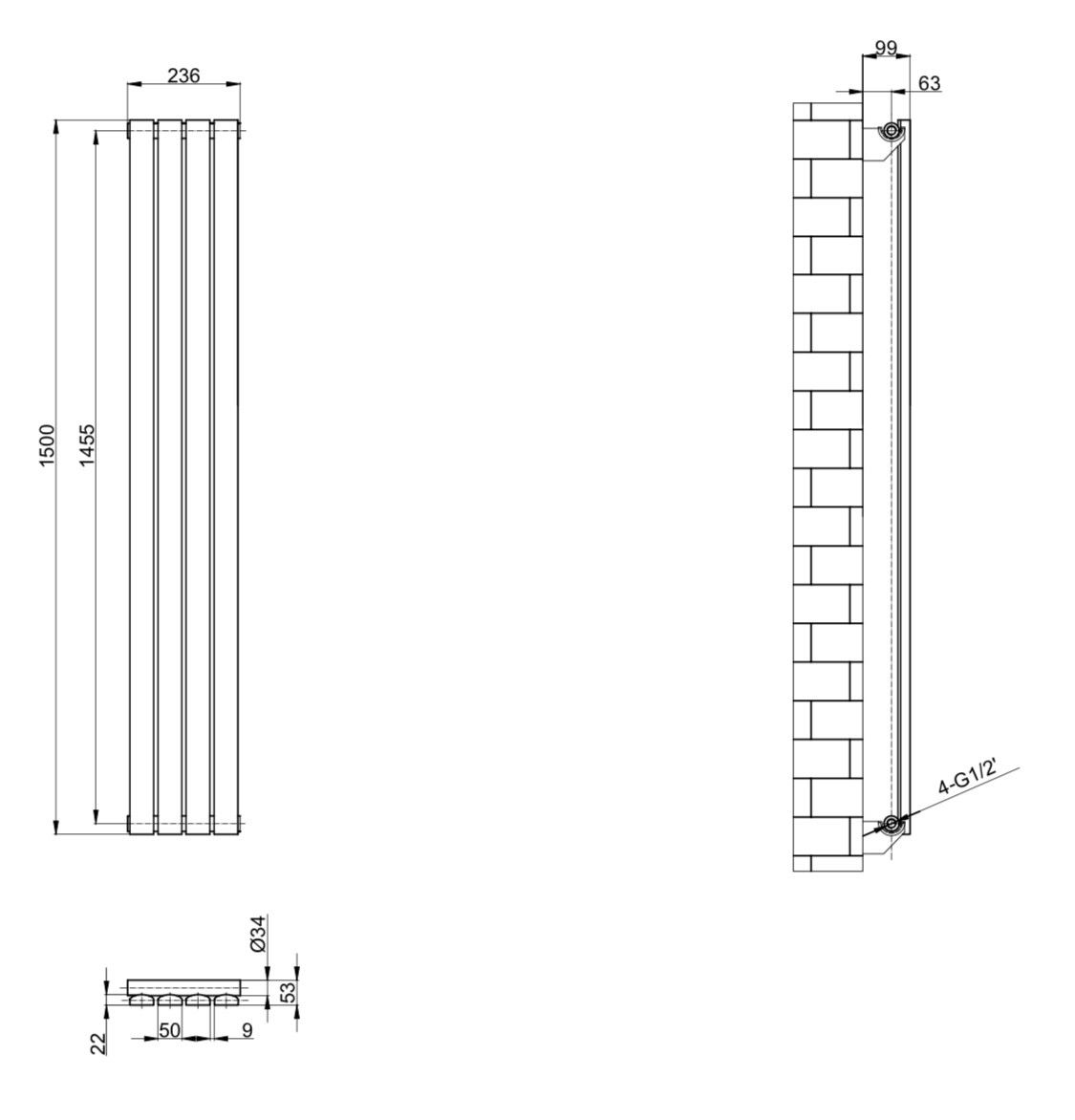 Вертикальний дизайнерський радіатор опалення ARTTIDESIGN Terni 4/1500/236/50 білий матовий