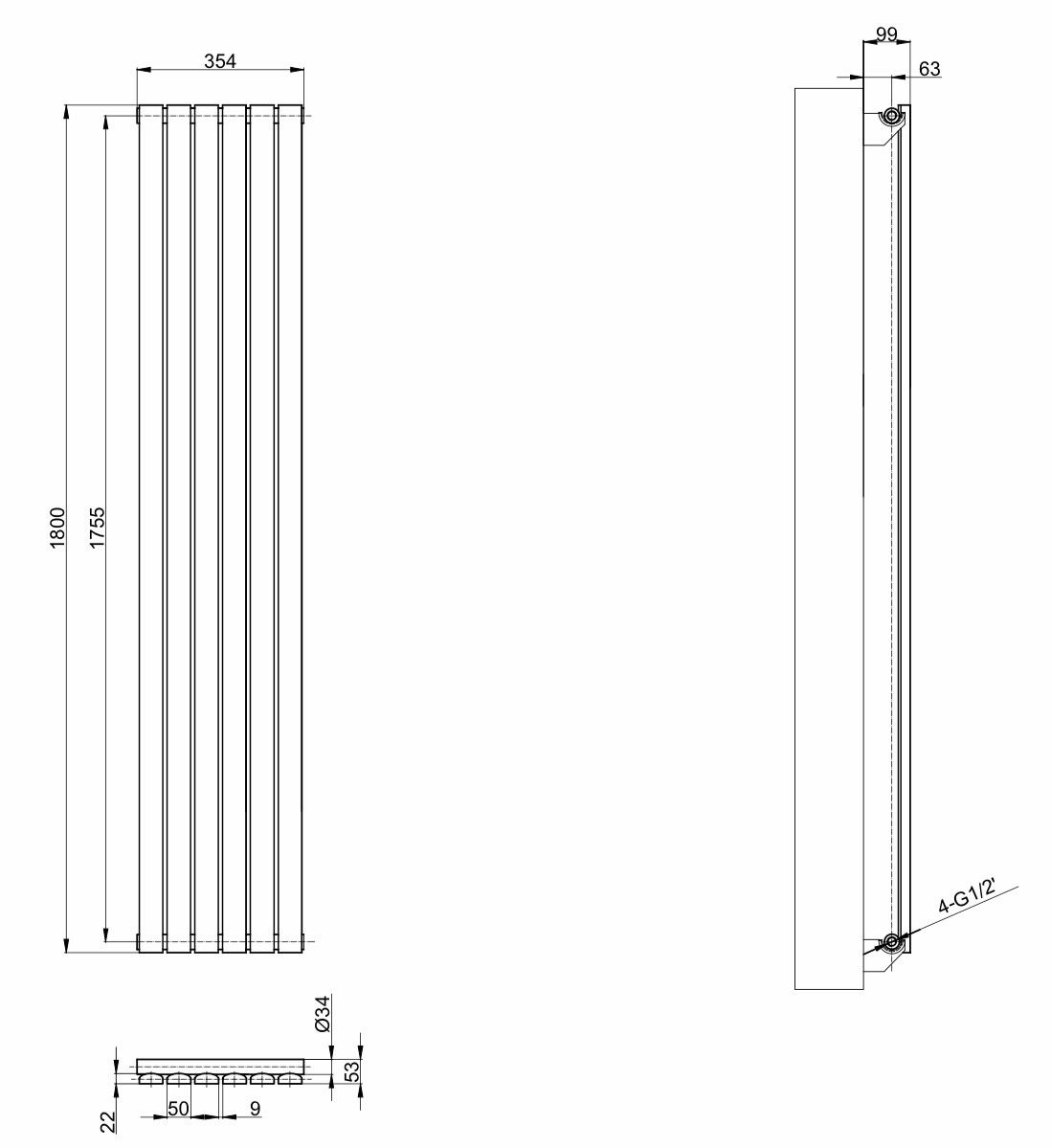 Вертикальний дизайнерський радіатор опалення ARTTIDESIGN Terni 6/1800/354/50 сірий матовий