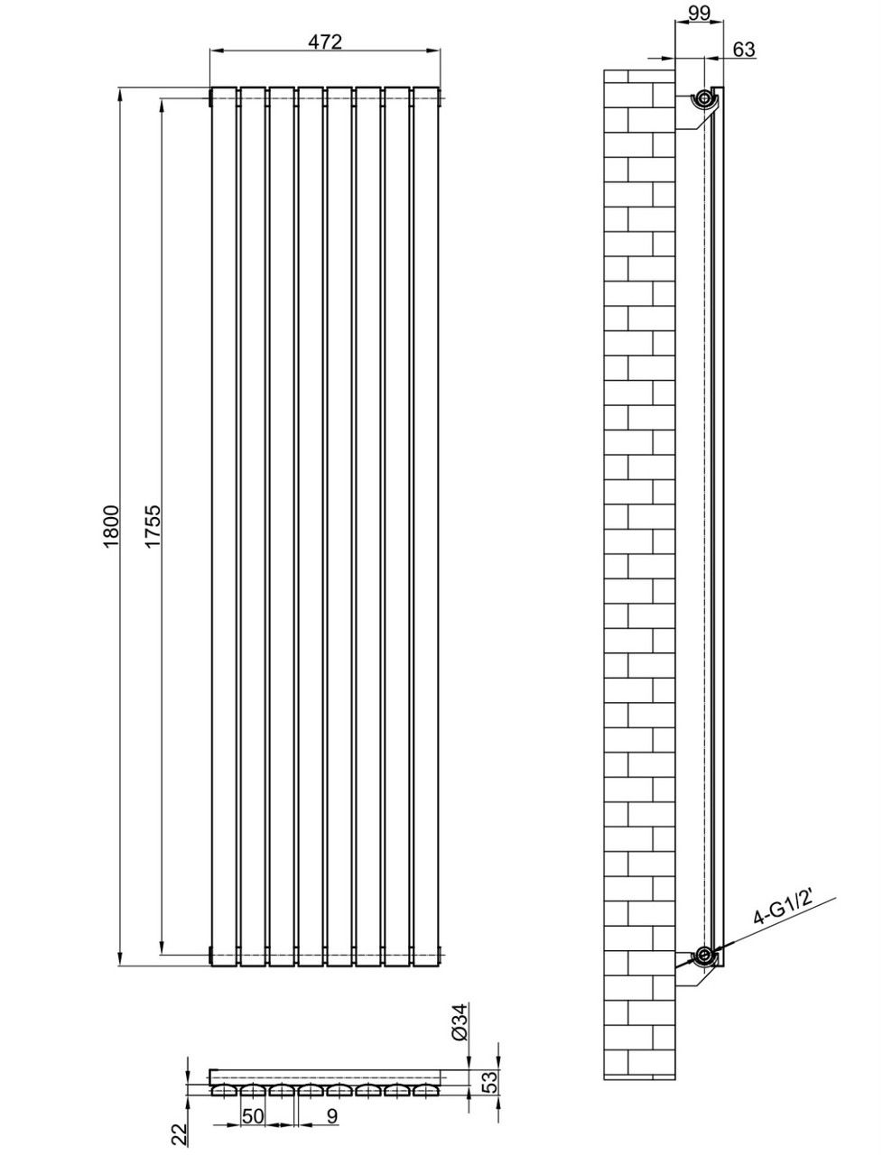 Вертикальний дизайнерський радіатор опалення ARTTIDESIGN Terni 8/1800/472 білий матовий
